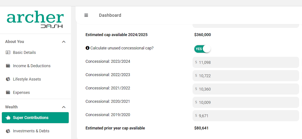 To set the unused cap so that Archer can accurately calculate it moving forward you can key the contribution details into this section. (Pic 1)