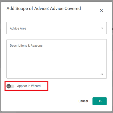 For example, if creating your own text for the Out of Scope section, and you would always like Social Security and Aged Care to appear as selected in the wizard, then mark the Appear in Wizard toggle as yes