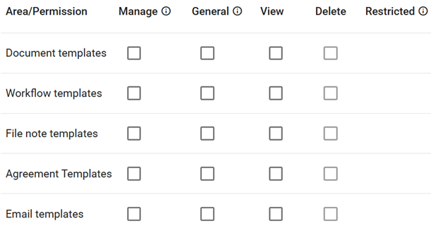 Group Templates ![]() | Permissions of Manage, General, View, Delete and Restricted can be chosen for each of these sections for Group Template management. |